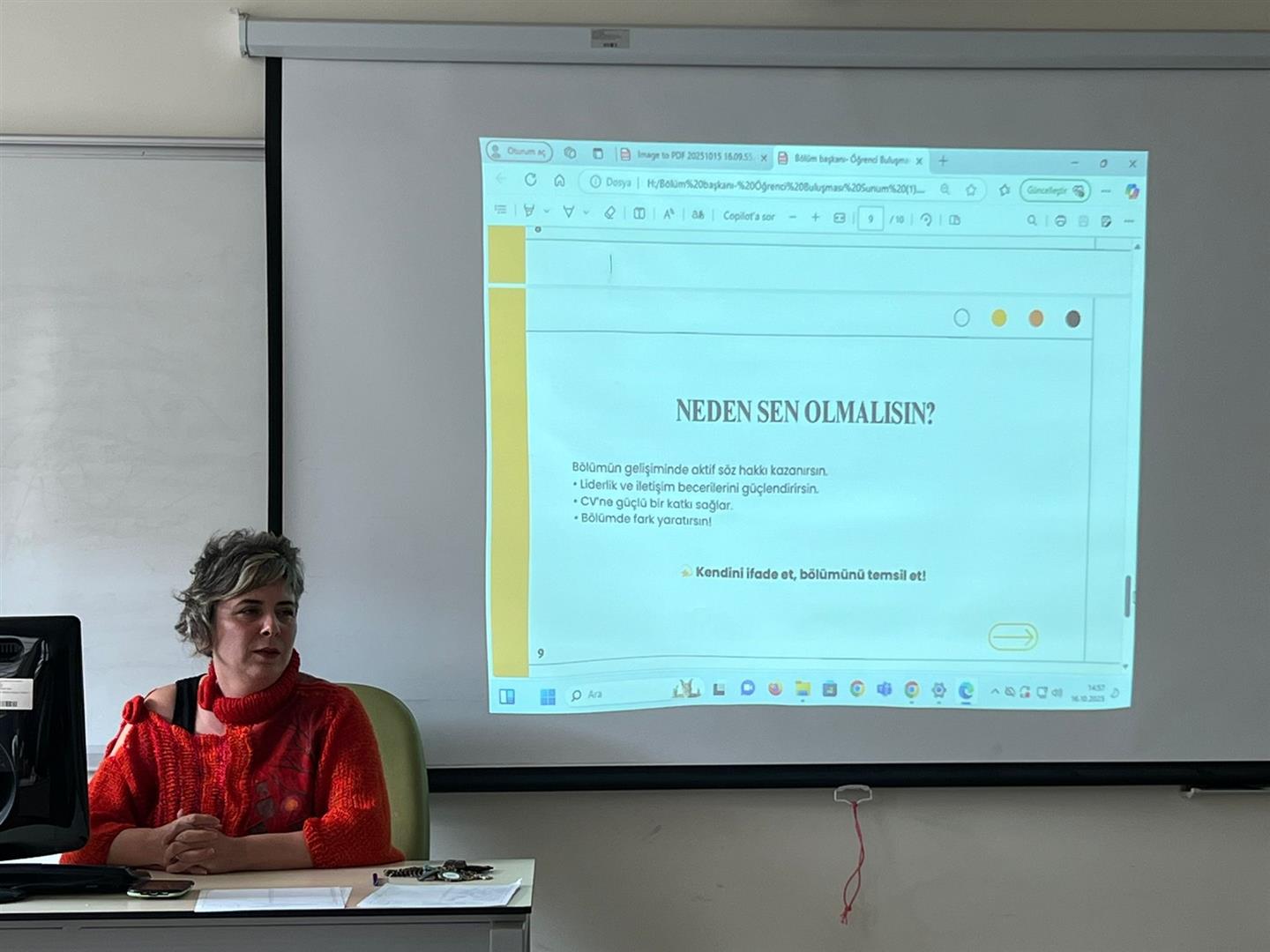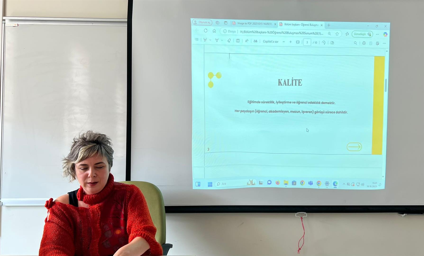 Bölüm öğrencilerimizin, kalite süreçlerine aktif katılımını desteklemek amacıyla bir öğrenci buluşması düzenlenmiştir. Etkinlik, Bölüm Başkanımız Doç. Arzu EVECEN’in koordinatörlüğünde 16 Ekim 2025 Perşembe günü saat 14.30’da, A11103 numaralı derslikte gerçekleştirilmiştir. Buluşmada, akreditasyon ve kalite güvencesi süreçlerine ilişkin güncel bilgiler paylaşılmış; kalite güvence sisteminin işleyişi hakkında bilgilendirme yapılmıştır. Etkinlikte, bölüm öğrencilerimizin görüş ve geri bildirimlerinin bölümümüzün gelişimine önemli katkı sağladığı belirtilmiş; her sınıftan, gönüllü öğrenciler arasından seçilen temsilciler belirlenmiştir.