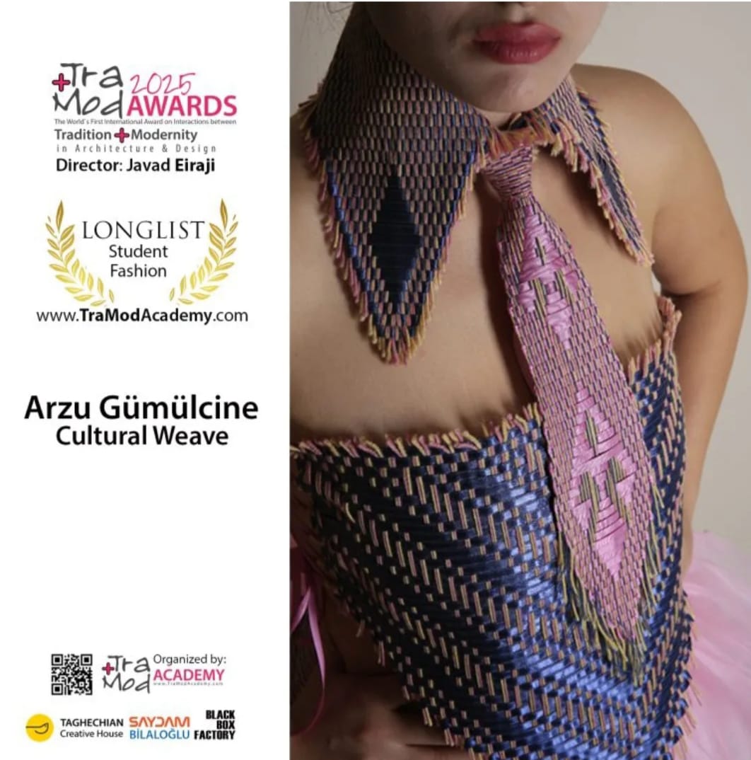 Tekstil ve Moda Tasarımı Bölümü 4. sınıf öğrencimiz Arzu Gümülcine, 40 ülkeden 200’ü aşkın profesyonel ve öğrenci projesinin değerlendirildiği Uluslararası Tramod Awards yarışmasında önemli bir başarıya imza attı. İç mimarlıktan endüstriyel tasarıma kadar altı farklı disiplinde gerçekleştirilen organizasyonda Gümülcine, “Cultural Weave” adını verdiği çalışmasıyla Moda Tasarımı (Öğrenci) kategorisinde finalist olma başarısı gösterdi.