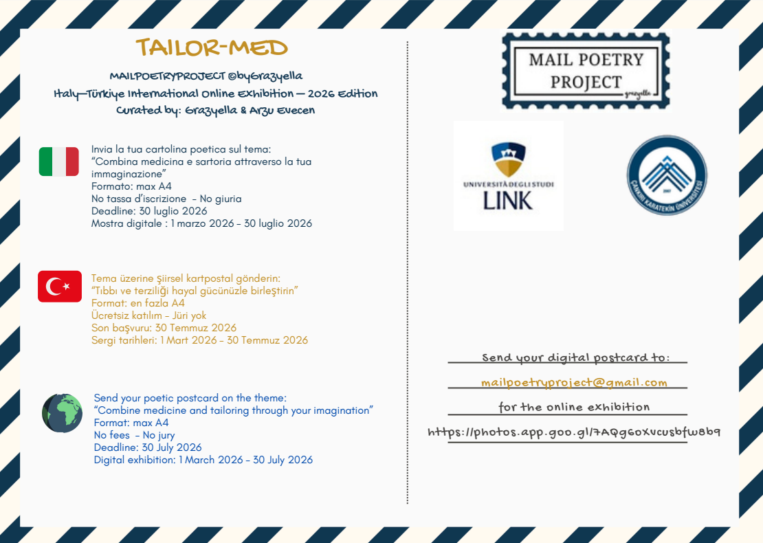 Çankırı Karatekin Üniversitesi Sanat, Tasarım ve Mimarlık Fakültesi Tekstil ve Moda Tasarımı Bölümü ile Link Campus University – Department of Life Sciences, Health and Healthcare Professions iş birliğinde düzenlenen “TAILOR-MED – Mail Poetry Project” başlıklı Türkiye–İtalya Uluslararası Çevrim İçi Sergisi için başvurular başlamıştır. Bilim ve sanatın estetik bir ortak dilde buluşmasını amaçlayan sergi, katılımcıları “tıp ve terziliği hayal gücü aracılığıyla birleştirme” teması üzerinden şiirsel kartpostallar ve görsel yorumlar üretmeye davet etmektedir.Küratörlüğünü Prof. Graziella Di Grezia ile Doç. Dr. Arzu Evecen’in üstlendiği sergi ulusal ve uluslararası tüm katılımcılara açıktır.